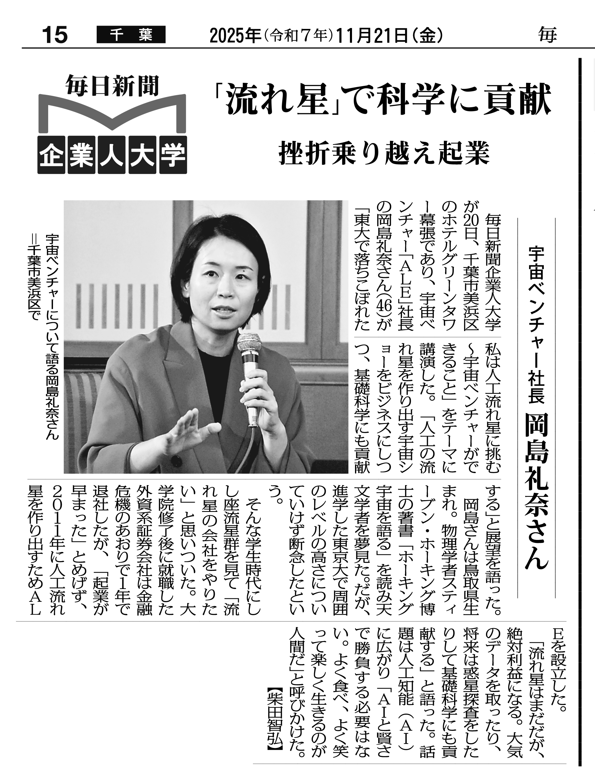 宇宙ベンチャー「ALE」社長 岡島 礼奈 氏